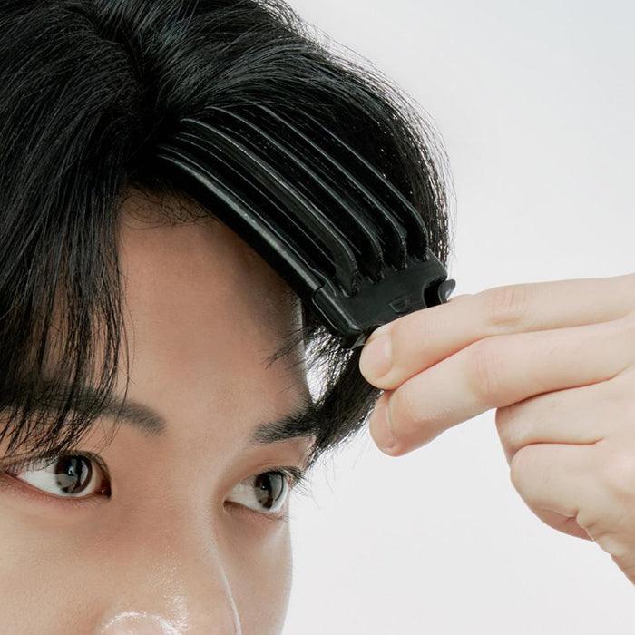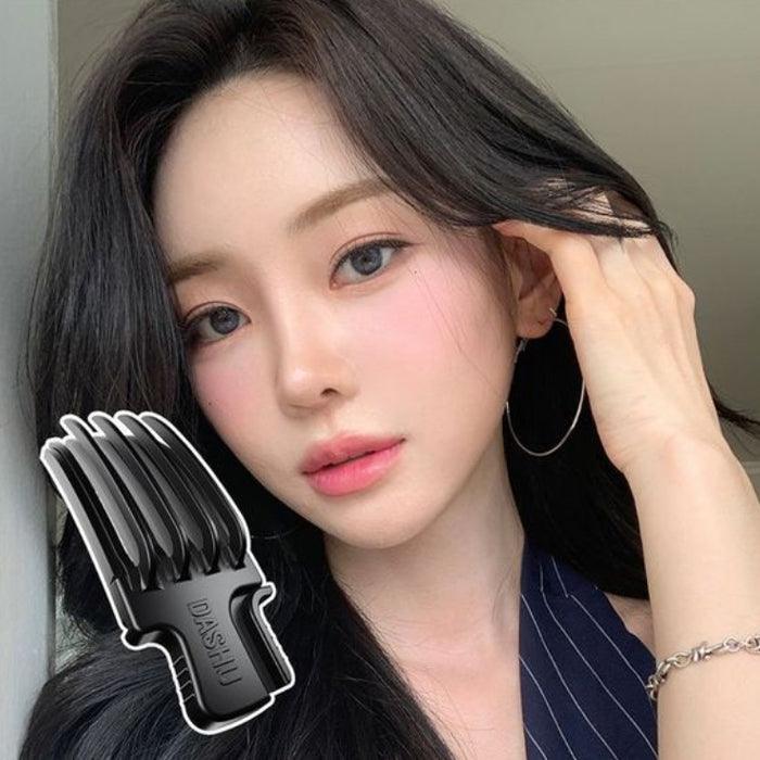1. Press the volume pick handle to spread it to both sides, then fix it on the bangs. (It will be more firmly fixed if you insert it close to the scalp.)