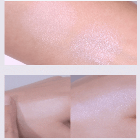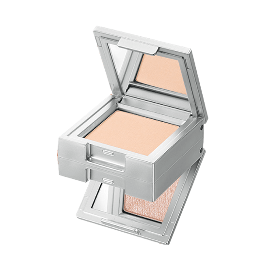 The soft and fine textured 2-step mixed coating powder with added fine pearl particles adheres lightly to the skin in one layer for a rough finish.