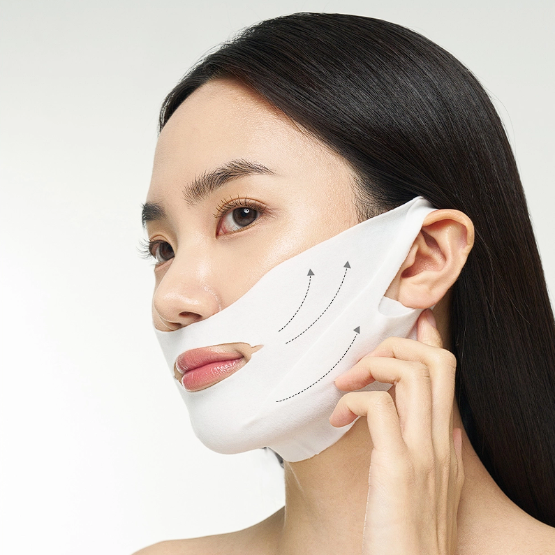 3. Remove the bottom part of the film and apply it to the center of the chin, then slowly pull and hang it around your ears.