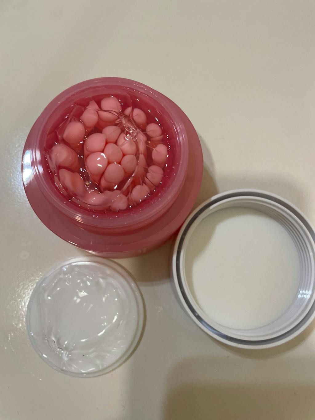 At the last step of skin care, mix the pink capsules and transparent gel on the back of your hand and gently apply it along your skin texture.