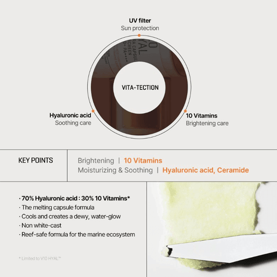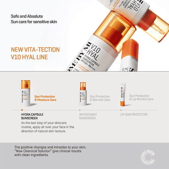 • Meet the New derma Sunscreen formula by SOME BY MI - V10 Hyal. Strong UV protection. 10 Types of Vitamins. Hyaluronic Acid